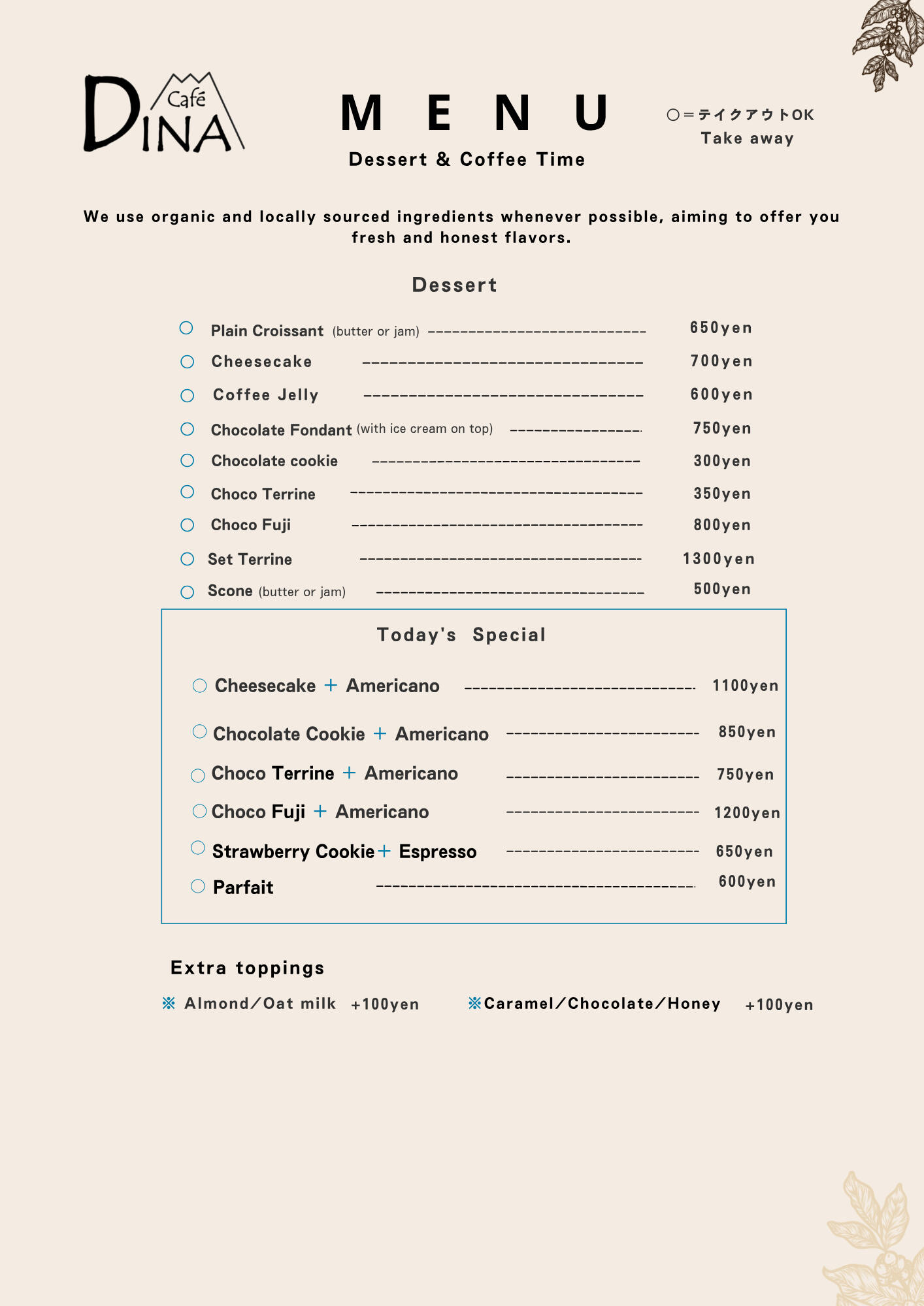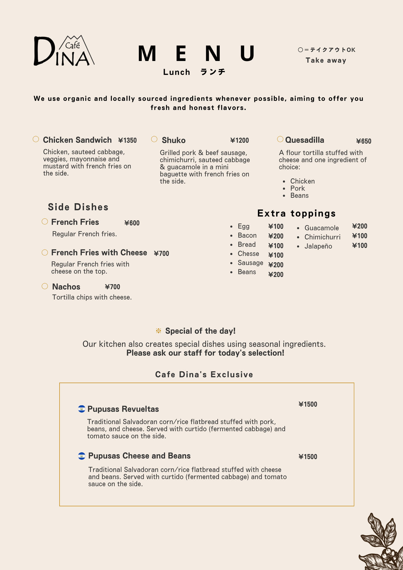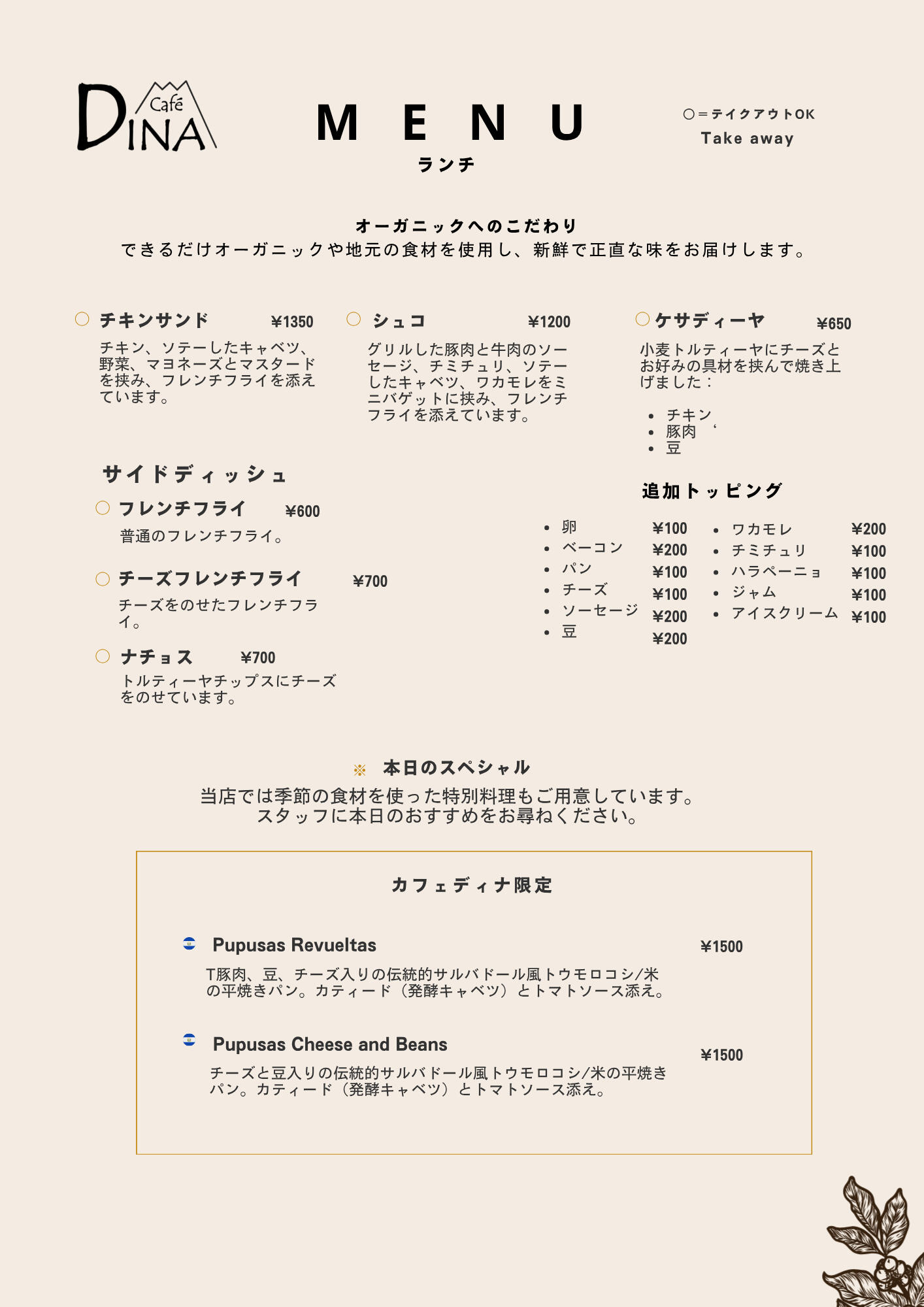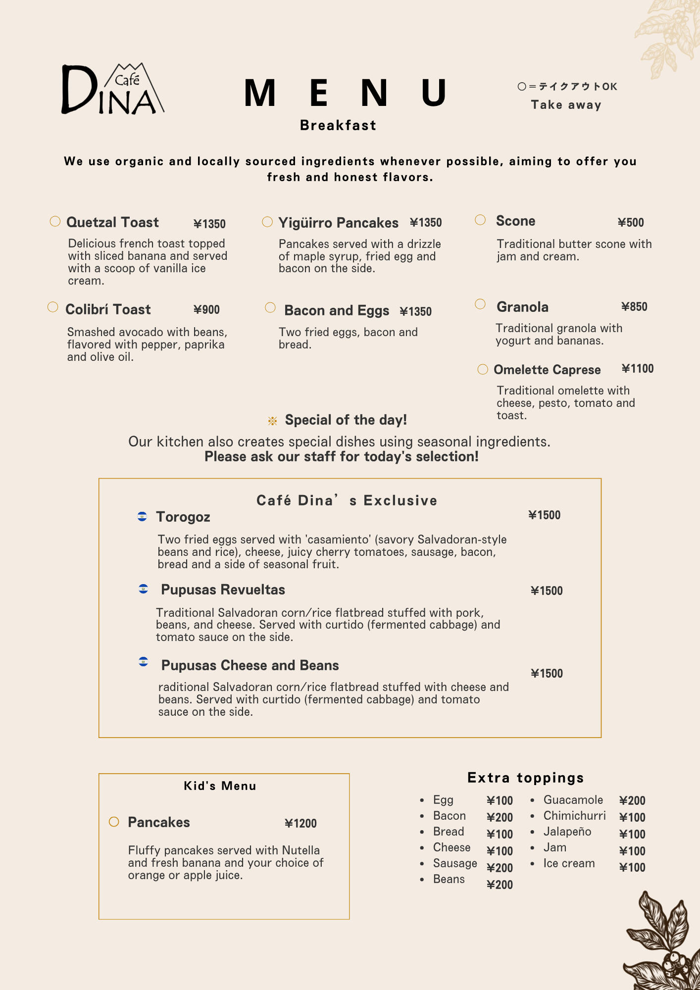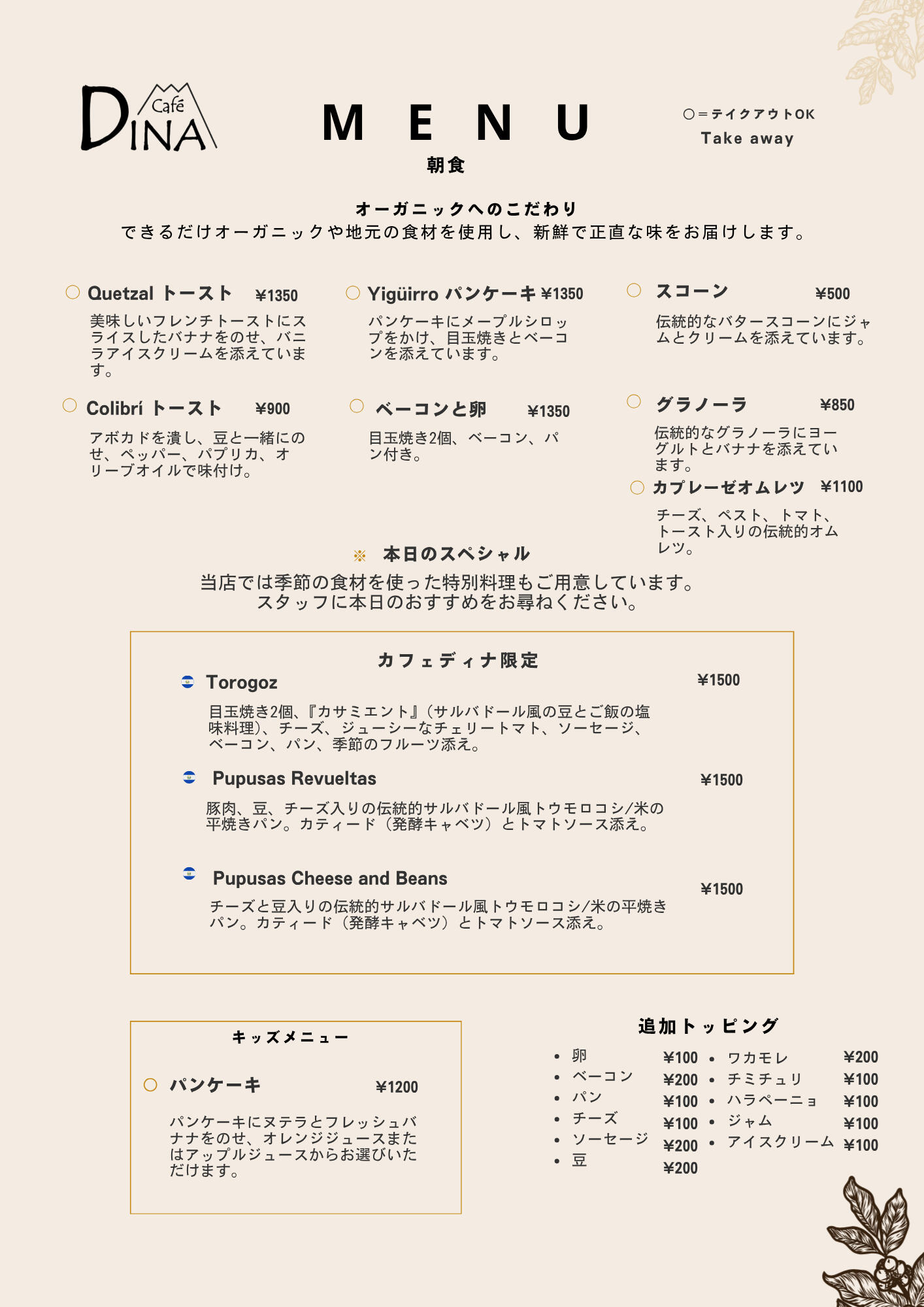 朝食 09:00〜12:00 昼食 12:00〜14:00ラストオーダー 13:30